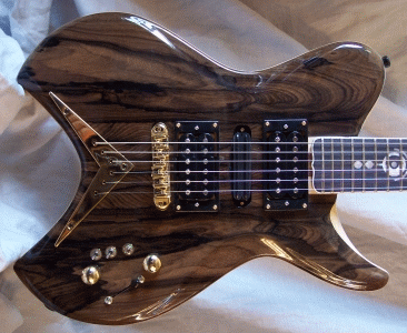 | The Christa is a bold guitar meant for the "classy" hardrocker and mean rockabilly picking viper who perhaps drives a 57' Chevy to boot. Based on some mainstream "conservative" designs, the Christa is elegant, thick-bodied, yet 1/2 the weight of a Les Paul Standard. The above featured custom-made guitar has a "Nogales" body with a quilted maple top. | |