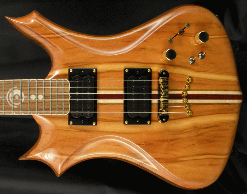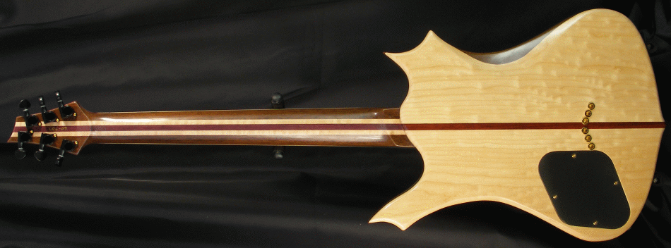 Neck: Peruvian walnut, maple. bloodwood, lemonwood HS, brass truss cover. * Body: lemonwood top, Peruv. walnut, maple back, bloodwood thru-speeder * Pickups: 2x custom 10, 8.5 oHm balanced coil tapped * Electr: vol, tone, 5-way switch, 2-mini switches single to humbucker * Bridge: LP wide rollers, three way adj. * Tail: thru-body ferrules * 24 Fret: med-jumbo on rosewood, crop circle inlays (trade- mark) bl. side pos. markers, 4.3cm nut, 5.7cm end, graphtech nut * Tuners: bl/gld locking * Construction: Solid * Sound: warm/mid/highs, power * Weight: light (7.3 pounds) * Hardware: gold/black |