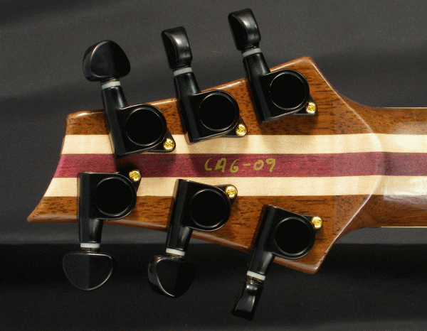 | CASTA (CA 6-09) This is a lemonwood top Casta. It is light in weight and stays in perfect tune due to the slightly angled headstock and self-lubricating graphtech nut. Semi-gloss natural (no stain). The glassy finish emphasizes the lemonwood book-matched top on a highly resonant Peruvian walnut core. All my guitars are hand signed at the headstock. It includes a hard-shell case. Type of strap buttons are optional. I don't apply those until the customer chooses which type (cost varies). Check out the details to the right. Email me with any questions: phiga@rgv.rr.com U.S. insured shipping is $ 50.00 anywhere in the U.S. Please contact me for international shipping. (I accept checks, money-orders or paypal with fee) "Note: I have not dressed or cleaned the fingerboards, as the type of fret crowning is up to the customer" |