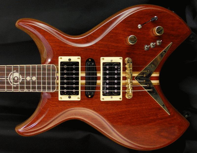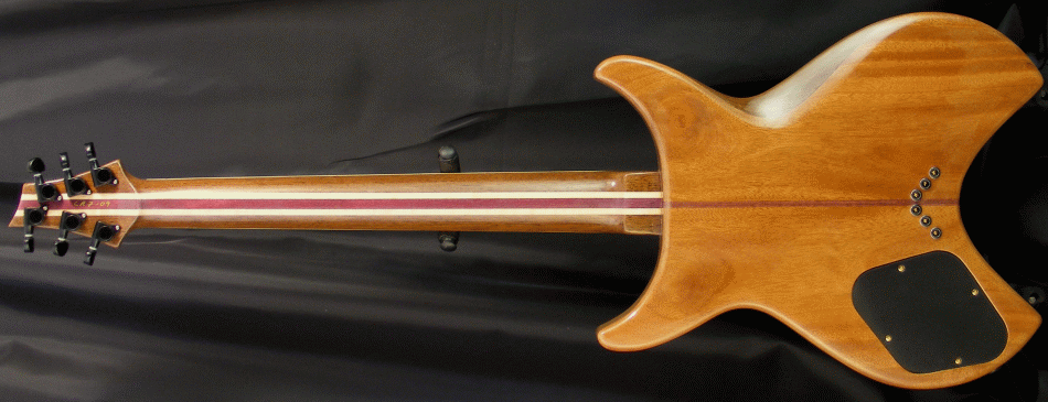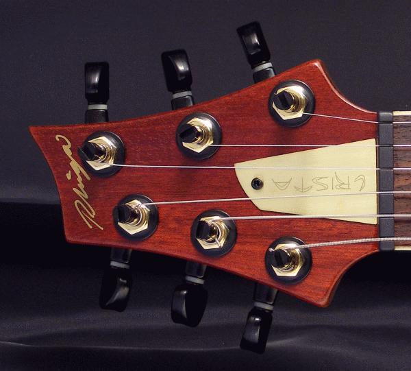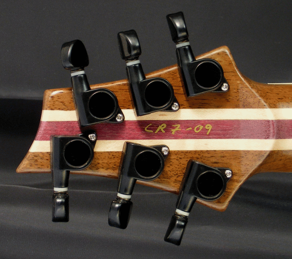 This is bloodwood top Crista. It is light in weight and stays in perfect tune due to the slightly angled headstock, self-lubricating graphtech nut and locking tuners. Peruvian walnut core for lush resonance and a honduran mahogany back. All my guitars are hand signed at the headstock. It includes a hard-shell case. Type of strap buttons are optional. I don't apply those until the customer chooses which type (cost may vary). Check out the details to the right. Email me with any questions: phiga@rgv.rr.com U.S. insured shipping is $ 50.00 anywhere in the U.S. Please contact me for international shipping. (I accept checks, money-orders or paypal with fee) "Note: I have not dressed or cleaned the fingerboards, as the type of fret crowning is up to the customer (flat or round)" |