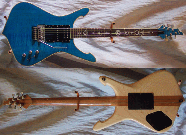 The H2 1/4" figure top with creme and abalone binding is one of my more difficult models to make. I have created 10 sofar (all those pictures were lost in a computer crash). As I make more, I will post more pictures. I am currently making a custom version (thru-neck). Perhaps I will post some of those through-out its completion. |